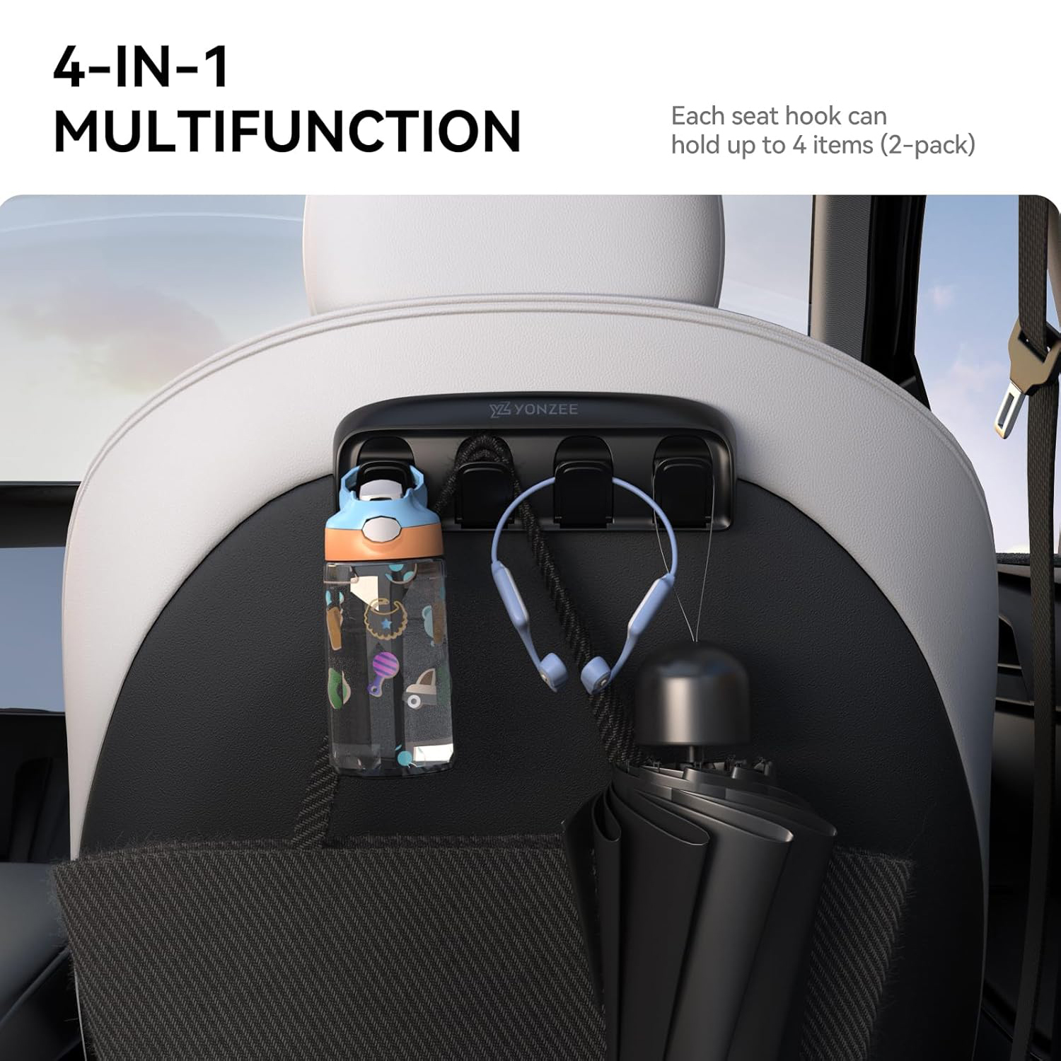 【4-IN-1 Multifunction】Each car hook features 4 storage hooks(2 packs just right for driver and passenger seats), use them to hang bags, jackets, purses, grocery bags, umbrellas, water bottles, trash bags, keychains, handbags, backpacks, mask and more.