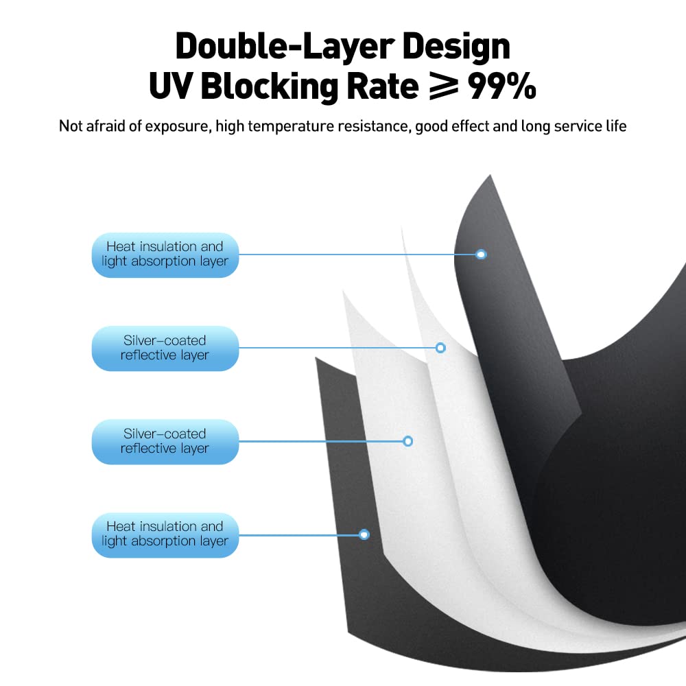 - Model Y sunshade set can all-round effectively block sunlight and harmful UV rays, soft and breathable. The sunshade made of dual-layer high density 210T reflective fabric, the black shading material ensures 100% light-proof, and the day is like the night. The thermal insulating layers can make shading and insulation more effective, keep the temperature comfortable in your car.
