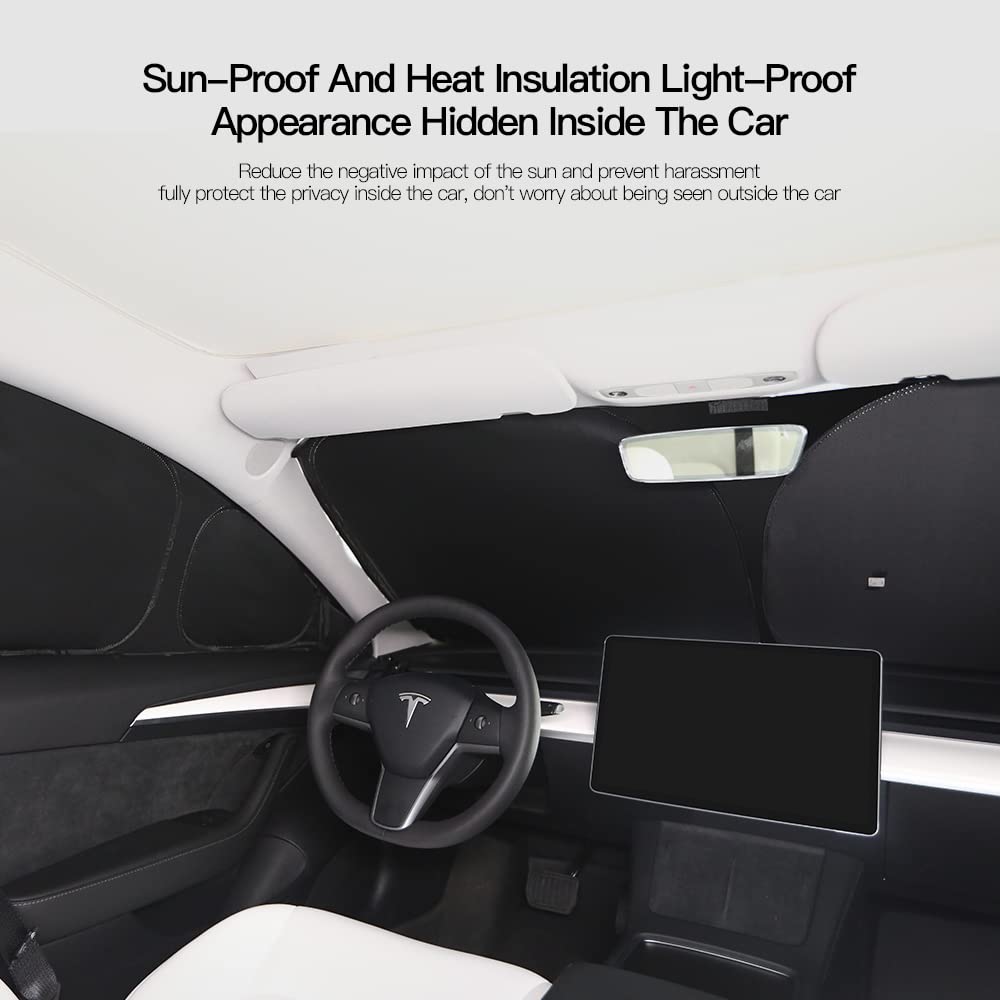 - The sunshade kit for Tesla model Y can be reduces car interior temperature by reducing heat transmission into the cabin by blocking 80% of solar thermal load, protect against damage caused by hot sunlight. Reject the harmful UV rays, protect your family's skin & eyes. The sun shade protective cover can reduce direct sunlight caused interior aging and preventing sun heating your vehicles interior, seats, dashboard and other electronic devices, extended service life.