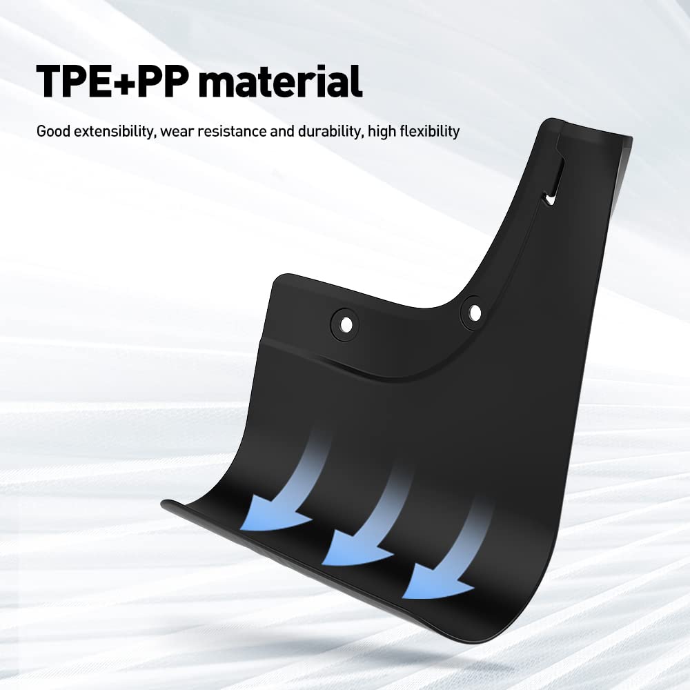 - The mud flaps for model Y are made of real TPE and PP materials, it has good thermoplasticity and extensibility, excellent anti-skid performance, and comfortable and delicate feel, sturdy and durable, strong impact resistance.