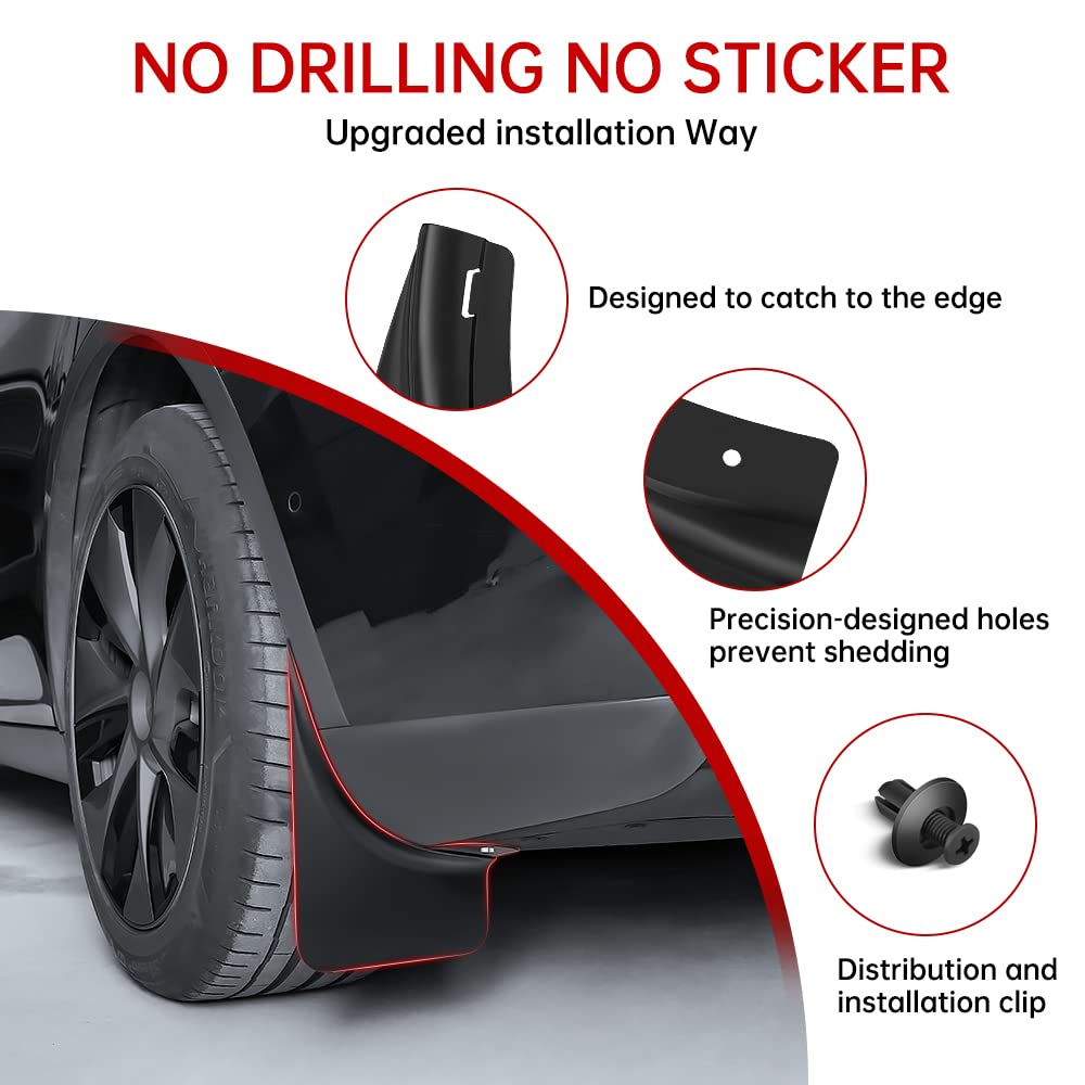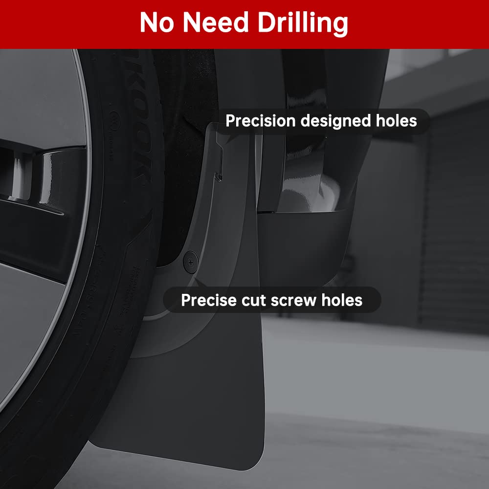 - Custom-made mud flaps for Tesla model Y, no need to drill holes and double tape, match with the original car hole position, just align the original car holes position(It is necessary to remove the screws at the original car hole, align and install the mud flaps, and then install the screws to fix it). The package comes with high-quality screws, safe and easy to install.